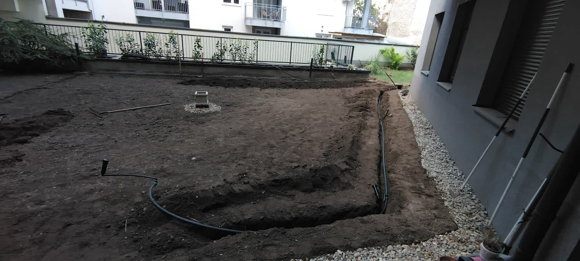 Társasházi kert megújítása öntözőrendszerrel és növényesítéssel