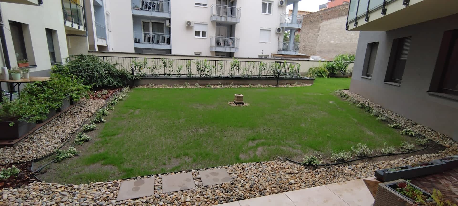 Egy szép, rendezett és könnyen karbantartható kert, amelyet a lakók közösen használhatnak és élvezhetnek – ráadásul a megfelelő öntözésnek köszönhetően hosszú távon is megőrzi frissességét.